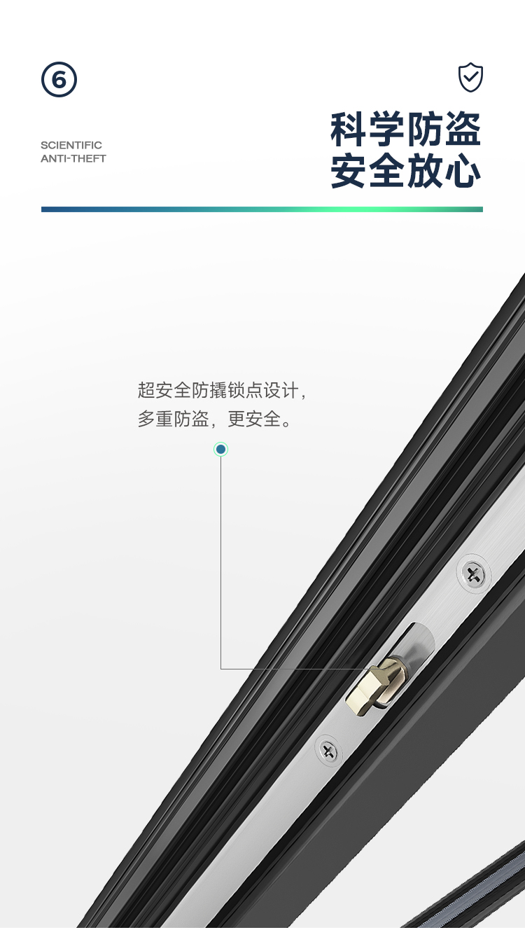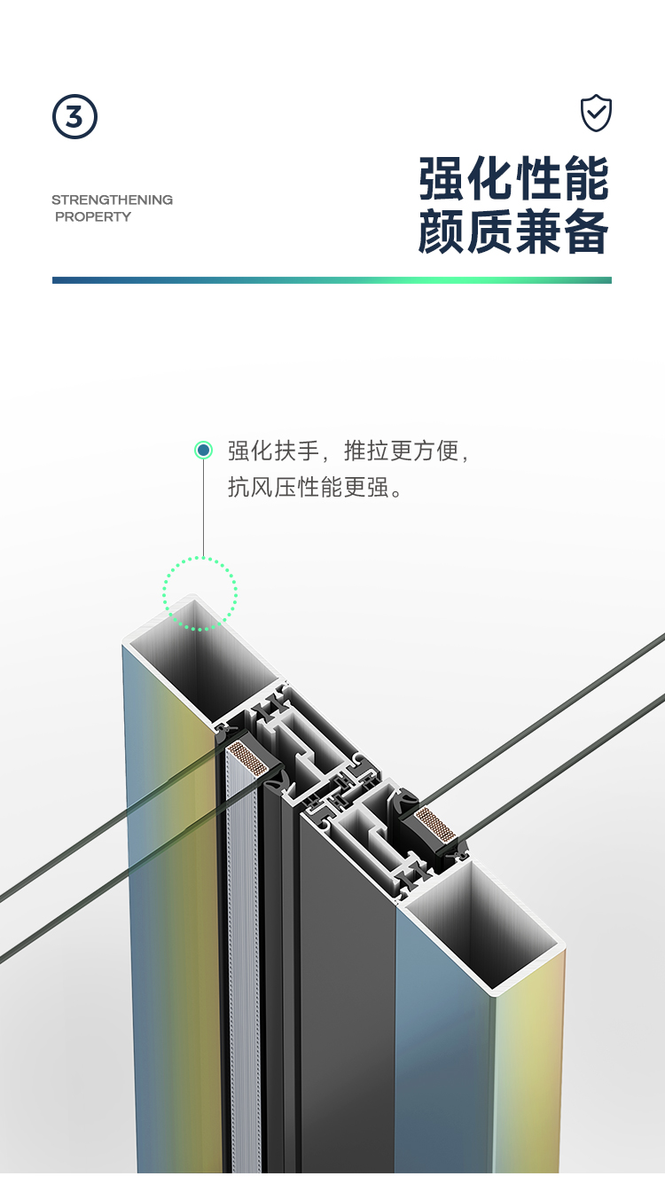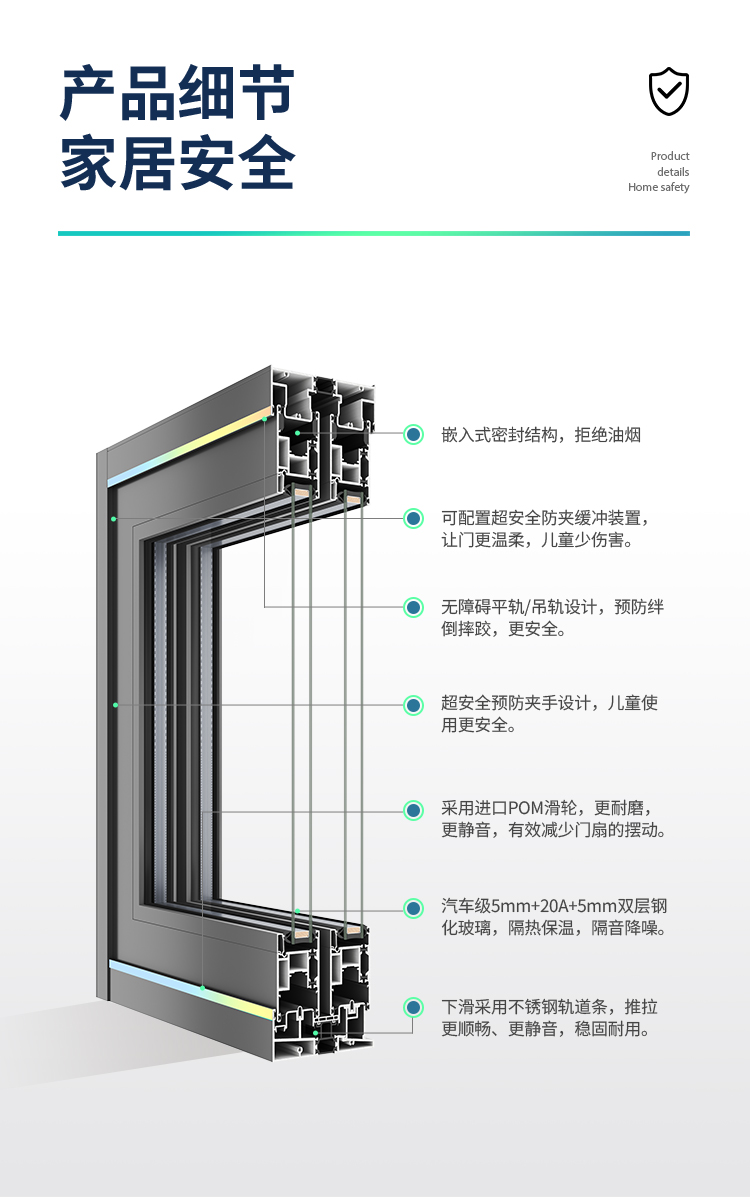 超國標,超安全,可設計超大開啟扇,超大視野; 超安全門扇防倒設計,預防脫軌、脫扇危險; 強化扶手,推拉更方便,抗風壓性能更強; 超安全重型滑輪,承重300KG; 超安全防撬鎖點設計,更安全; 嵌入式密封結構,搭配多重密封設計,更隔音; 海島防水排水設計,無懼暴風雨。