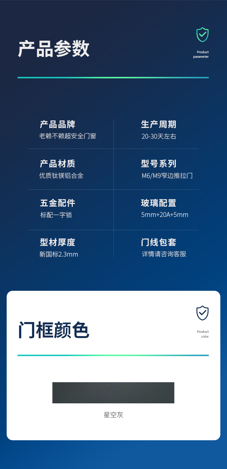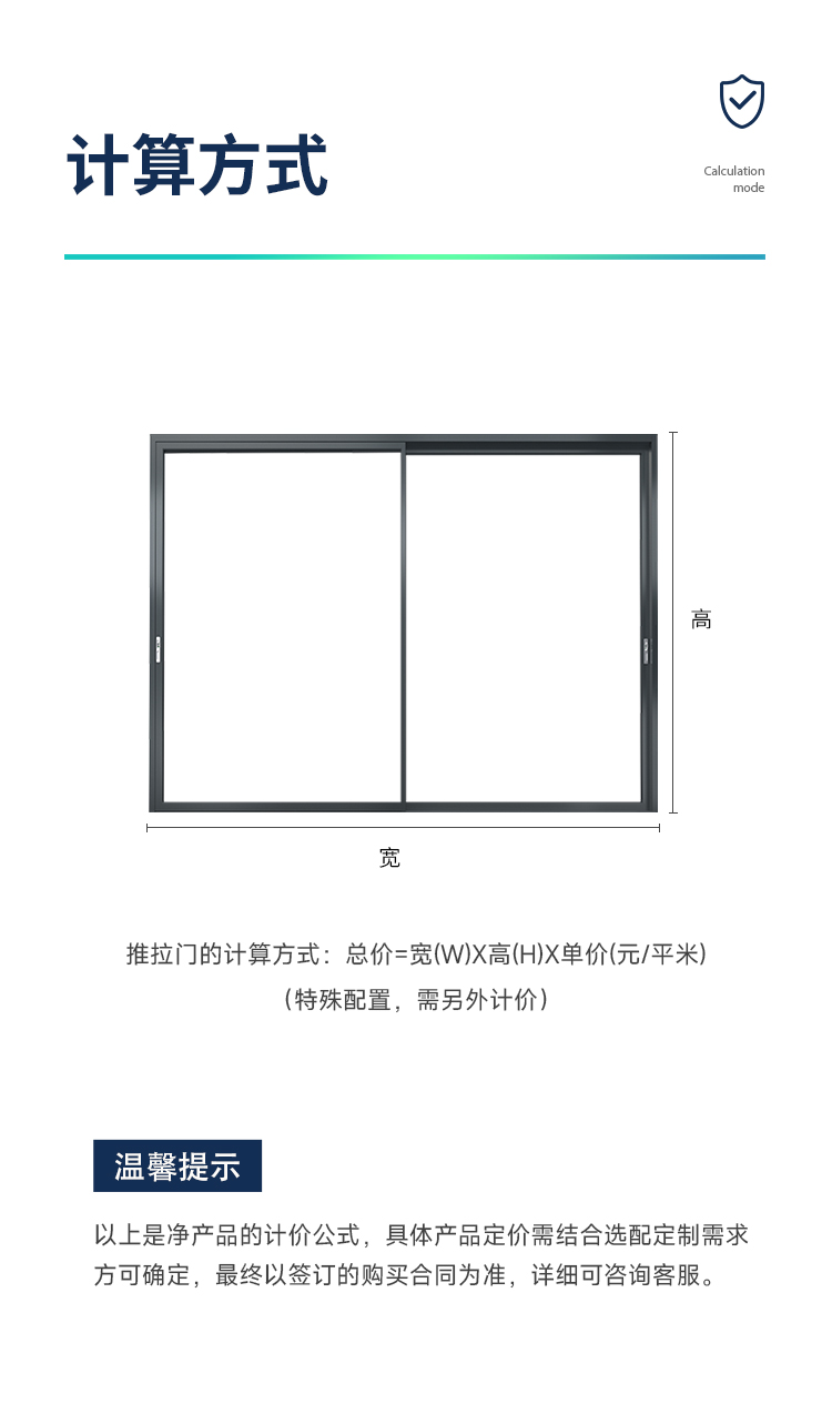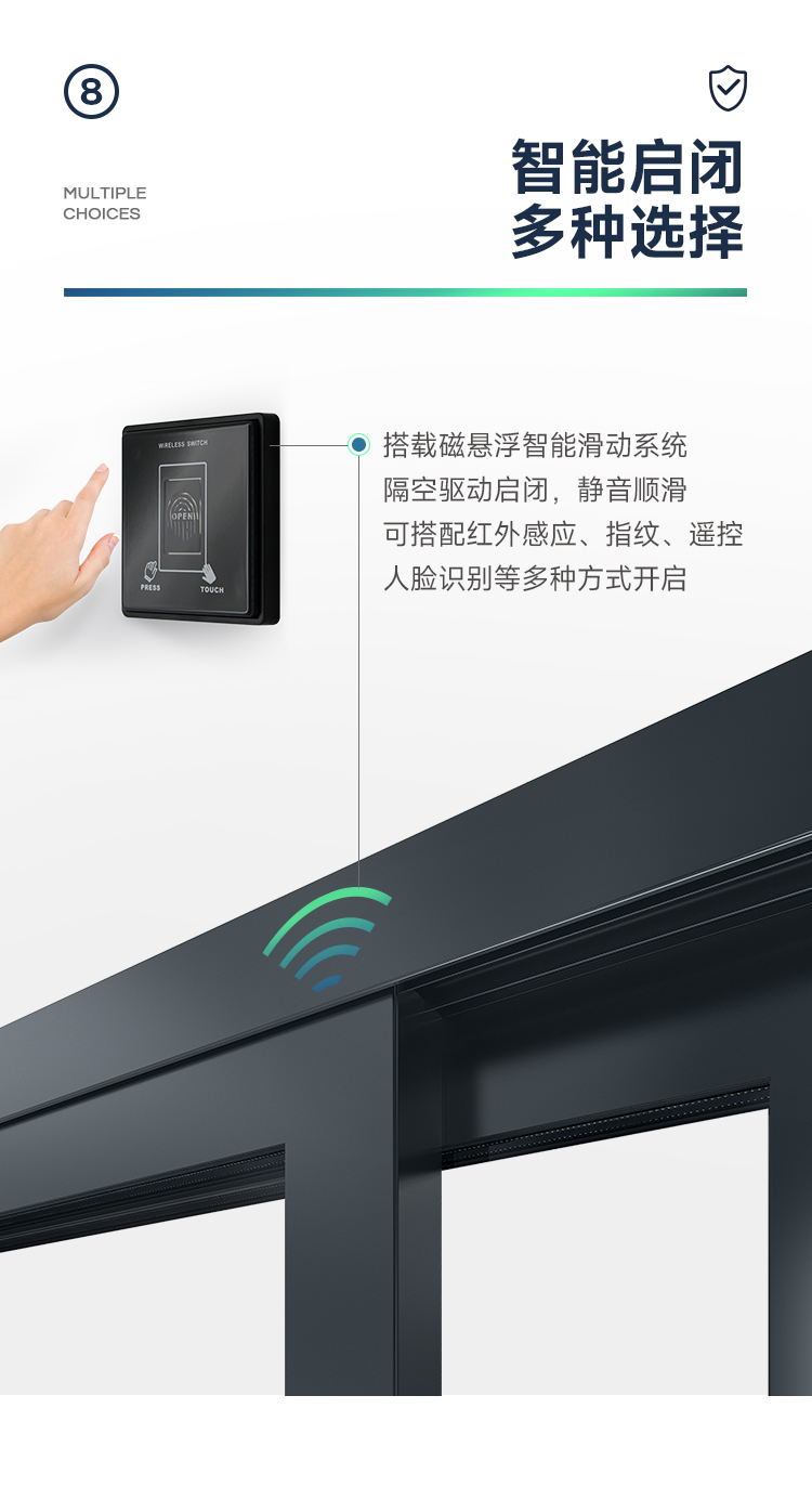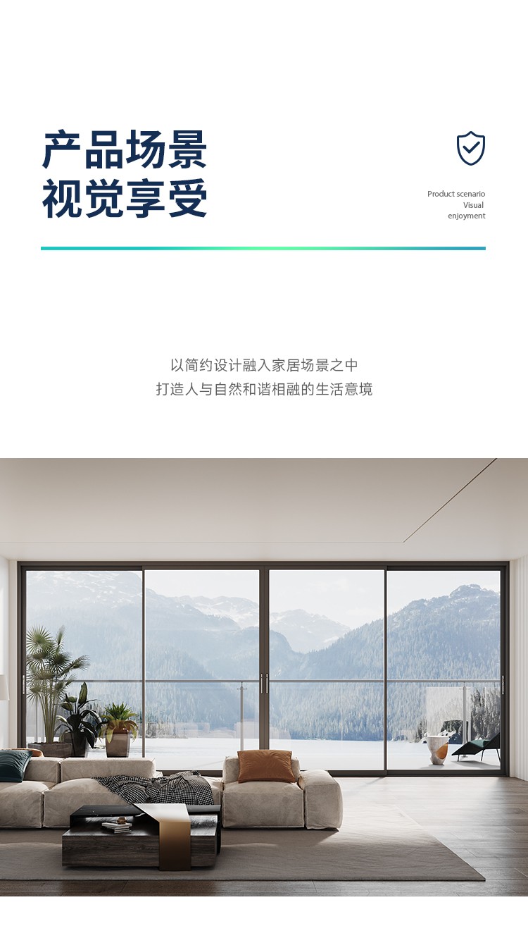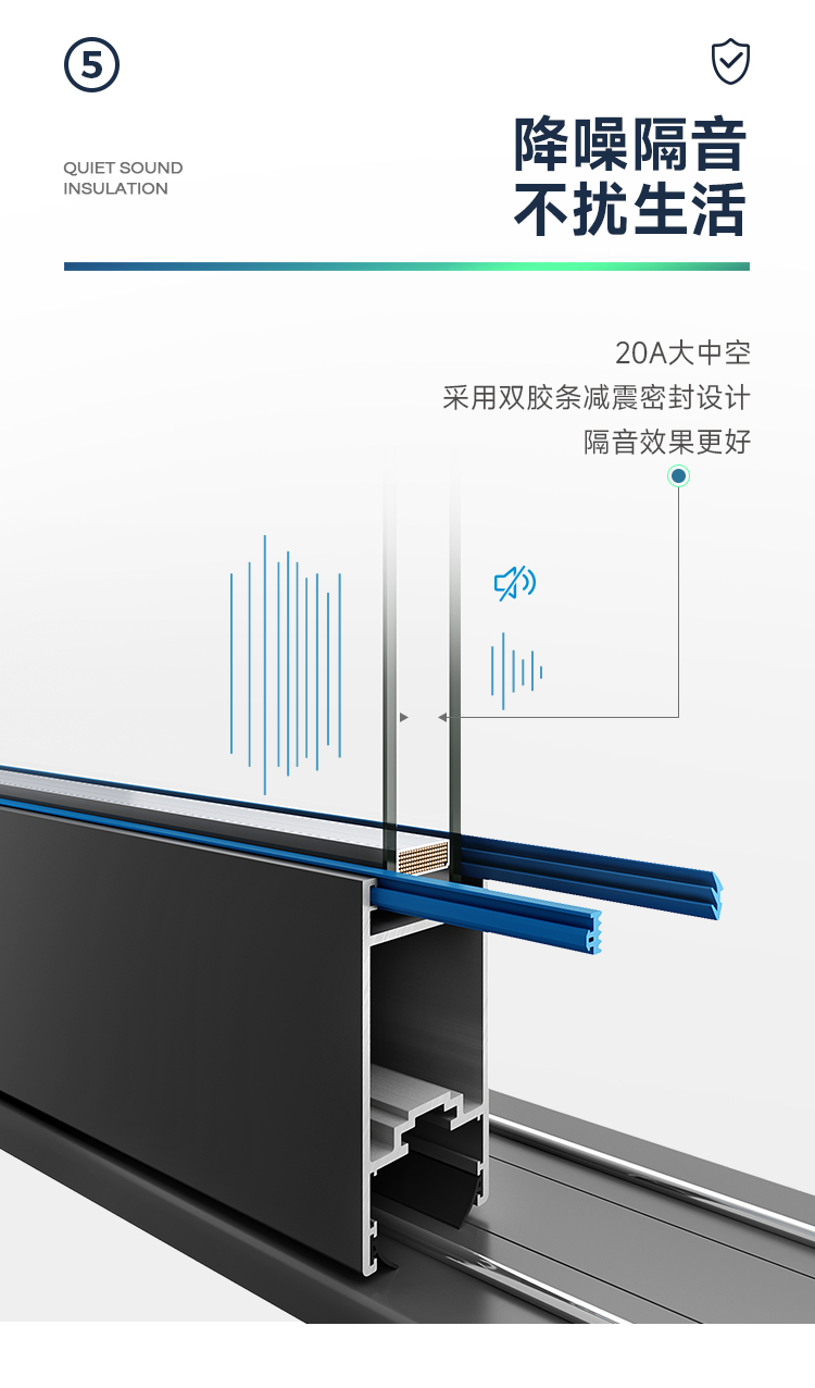 新國標2.3mm壁厚;微邊大視野,5.0mm增強抗壓; 大中空鋼化玻璃,采用雙膠條減震密封設計,隔音效果更好; 超安全重型滑輪,承重200KG; 超安全防撬鎖點設計,更安全; 可配置超安全防夾緩沖裝置,讓門更溫柔,兒童少傷害; 防水軌道、無障礙平軌,滿足室內外的不同需求; 磁懸浮升級款,盡享智慧生活。