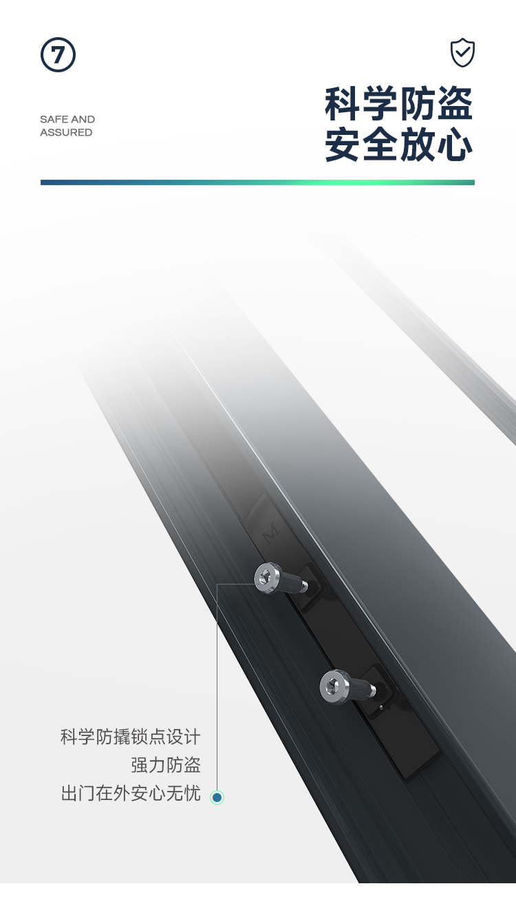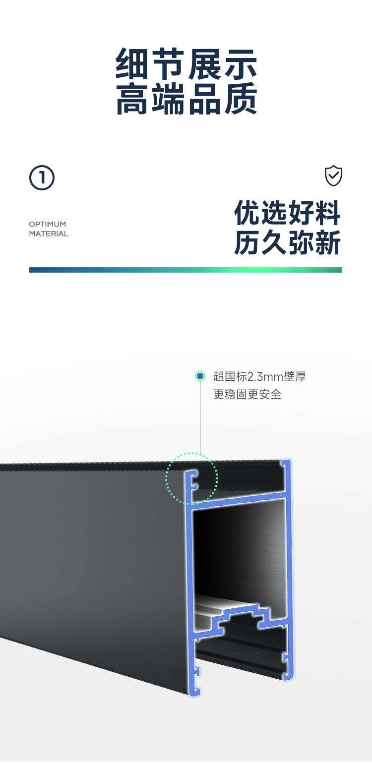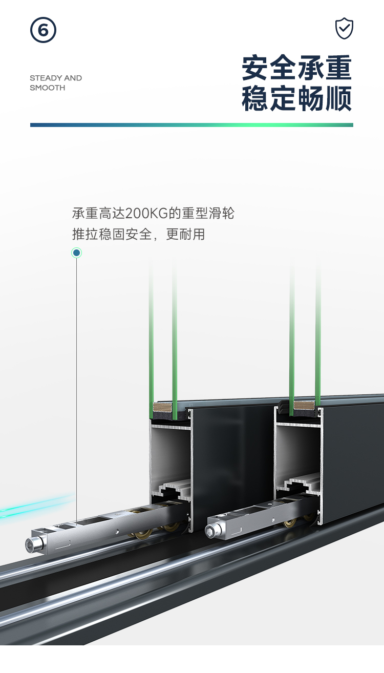 新國標 2.3mm壁厚;微邊大視野,5.0mm增強抗壓; 大中空鋼化玻璃,采用雙膠條減震密封設計,隔音效果更好; 超安全重型滑輪,承重200KG; 超安全防撬鎖點設計,更安全; 可配置超安全防夾緩沖裝置,讓門更溫柔,兒童少傷害; 防水軌道、無障礙平軌,滿足室內外的不同需求; 磁懸浮升級款,盡享智慧生活。
